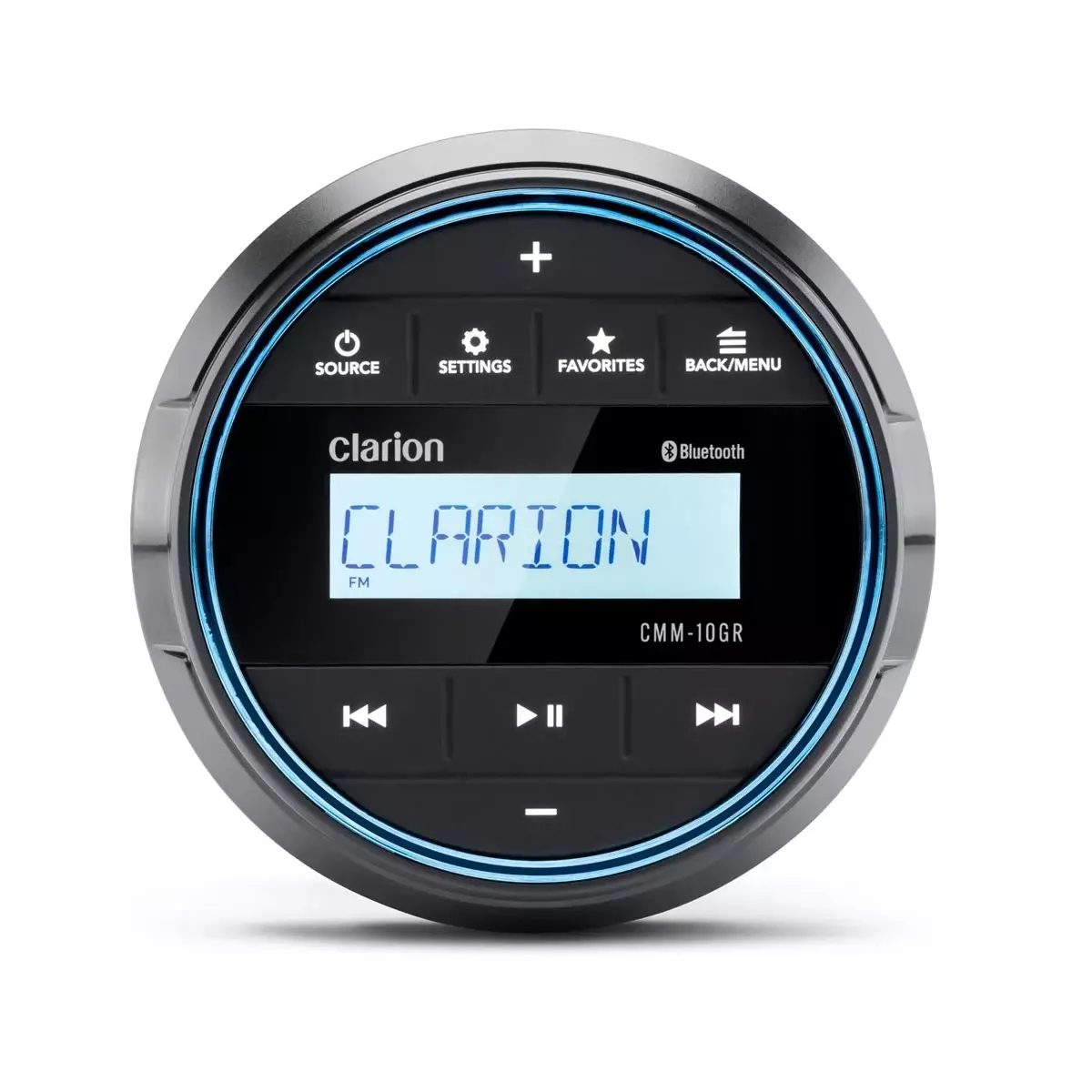 Clarion CMM-10GR on kestävä ja kompakti merisoitin, joka on suunniteltu erityisesti veneilyolosuhteisiin. Se tarjoaa selkeän LCD-näytön, intuitiivisen käyttöliittymän ja monipuoliset toistovaihtoehdot – mukaan lukien Bluetooth®-suoratoisto, USB-toisto ja FM/DAB+ -radio. Soitin sopii täydellisesti 3" mittaripaneeliasennukseen ja sulautuu saumattomasti veneen kojelautaan.