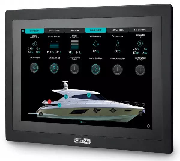 Uusi kaksiytiminen prosessori tekee käyttöliittymästä erittäin nopean ja responsiivisen. Touch 10 tukee CZone 2.0 -käyttöliittymää, joka on tuttu muista CZone-näytöistä ja helposti räätälöitävissä OEM-valmistajien tarpeisiin. Näyttö tarjoaa täyden hallinnan järjestelmän tiloista, piireistä ja valvontatoiminnoista, kuten tankkitasoista ja virrankulutuksesta.