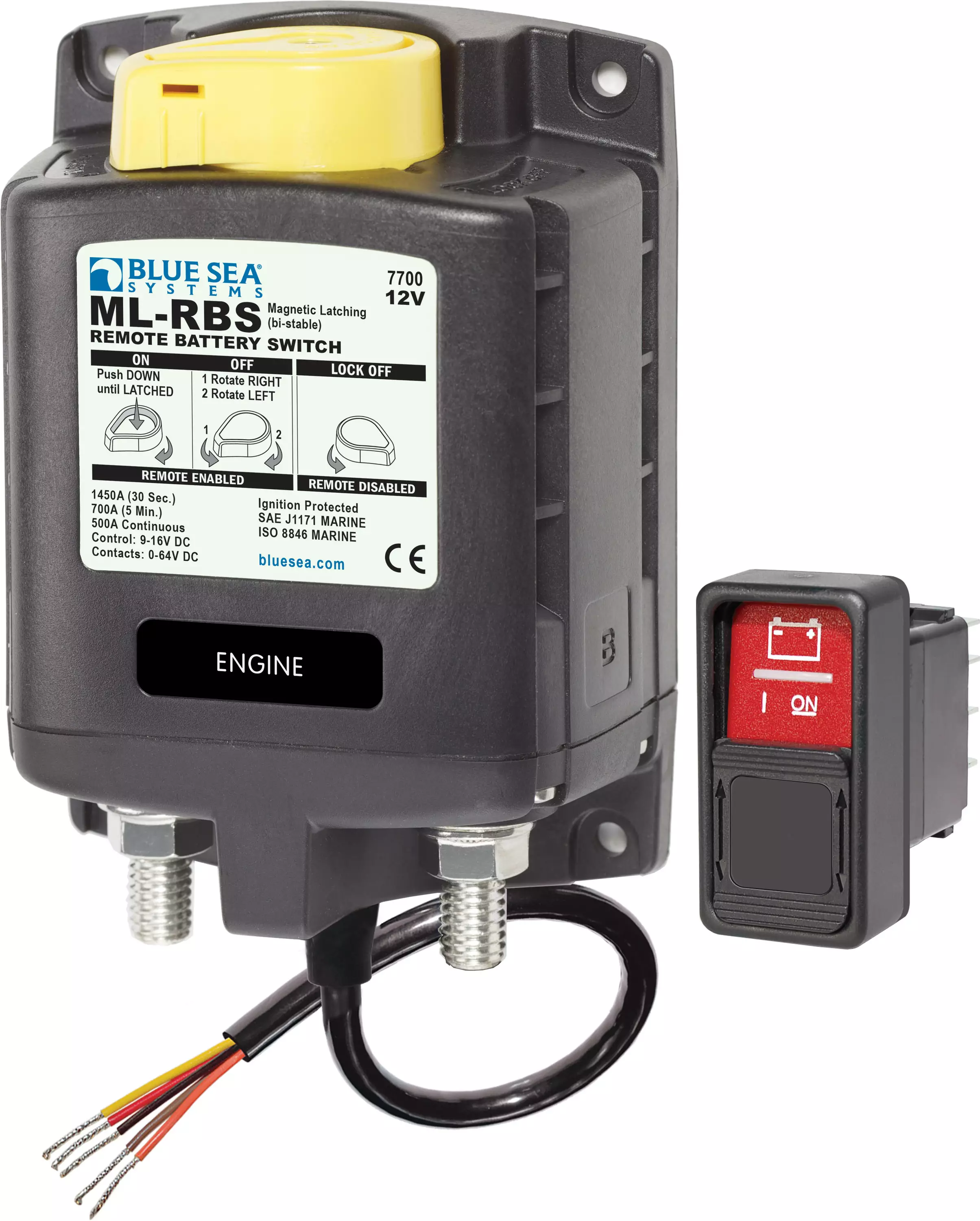 500A jatkuvaa virtaa kestävät ML-sarjan sähköiset pääkytkimet on suunniteltu suurten moottoreiden tai kuluttajien akkukytkimeksi. Niissä on tinatut kuparipinnat maksimaalisen korroosiokestävyyden saavuttamiseksi. Blue Sea Systemsin One Piece Stud-tekniikalla valmistetut liitospultit (M10) eivät löysty tärinästä. Pääkytkimillä on ISO8846 -sertifiointi eli ne saa asentaa samaan tilaan bensiinitankin kanssa.